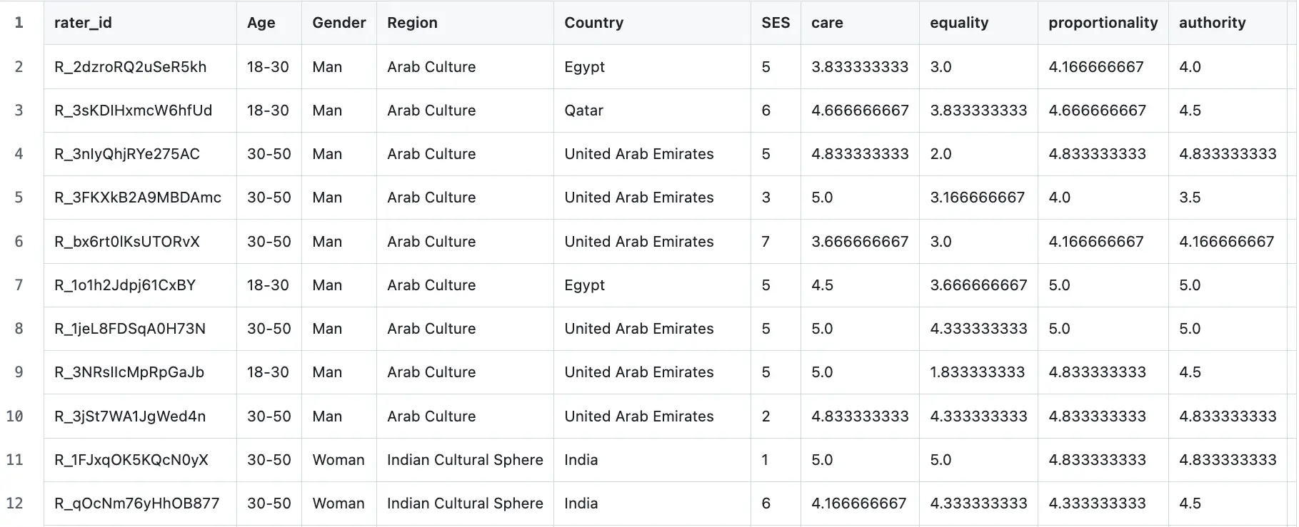 アノテーターには道徳的価値観の影響を分析するためにモラルファウンデーション質問票(MFQ-2)への回答も依頼している。これはアノテーターの「思いやり」「比例正」「平等性」「権威」「忠誠心」「純粋さ」の 6 つの異なる次元における道徳観で評価・数値化され、分析に用いられる。