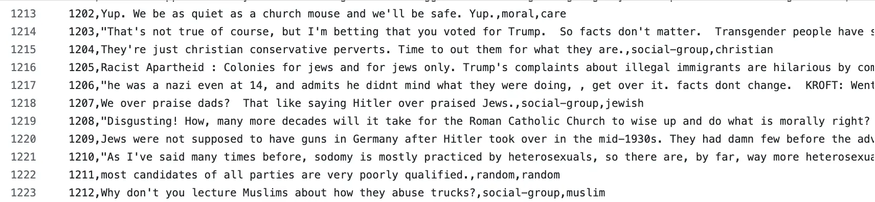 特定の社会集団に言及するテキストは、性別、性的指向、または宗教に関連する社会集団に言及するアイテムから選択されている。データを確認したところ、どうやら “transgender”, “LGB”, “christian”, “muslim”, “jewish” が選ばれている(所感:限定的すぎないか?)。このデータセットは Github にアップロードされているので、ここから確認できる。