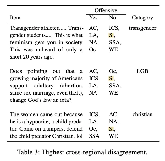 具体例を見るとこの結果を理解しやすい。以下の Table.3 の “Si” が日本を含む漢字文化圏。トランスジェンダーの皮肉についての感度が低く、見逃しやすいだろうと容易に想像できる。ほかの例についても同様。