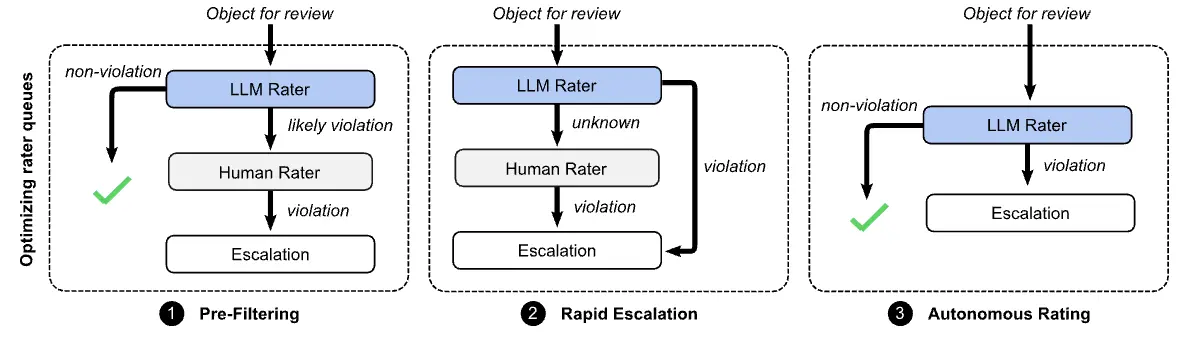 有害コンテンツ(ヘイトスピーチ、嫌がらせ、過激主義、選挙の虚偽情報)のモデレーションにおいて、人間の評価者とLLMが協調するデザインパターンを5つ提案している。加えて、Google のコンテンツプラットフォームにて非公開データセットを構築して実証実験を実施している。