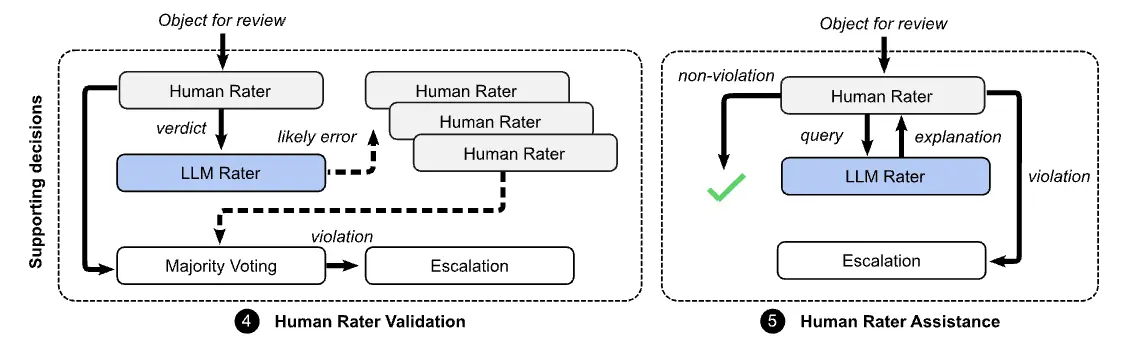⑤の人間評価者のアシスタンスは、潜在的に違反しているコンテンツのコンテキスト理解に役立つ。人間の評価者はLLM raterと対話して、コンテンツが違反している理由、または違反していない理由の説明を受けることができる。例えば、ポリシーに違反している可能性のあるコンテンツの特定の箇所を強調表示するなどが機能として挙げられる。