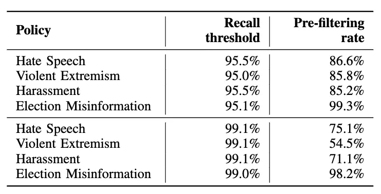 実証実験では、再現率のしきい値を 95% に設定した場合、最大 86.6% のコンテンツをポリシー違反なしと判断し、人間の評価者によるレビューを削減できることを示している。さらに、再現率のしきい値を 99% に設定した場合でも、最大 54.5% のコンテンツをフィルタリングできたと報告している(所感:めちゃ大幅に削減できるすごく良い)。結果は以下の通り: