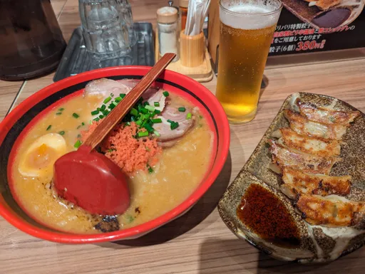 新千歳空港に到着後、ラーメン道場で昼食をとる。ラーメン道場は新千歳空港の国内線ターミナルビルの3階にあるラーメン屋が集まった食堂で、北海道のラーメンを食べ比べることができる。物珍しさから、一幻のえびそばをビールと餃子とともにいただいた。濃厚なスープとえびの風味がよく合っていて美味。