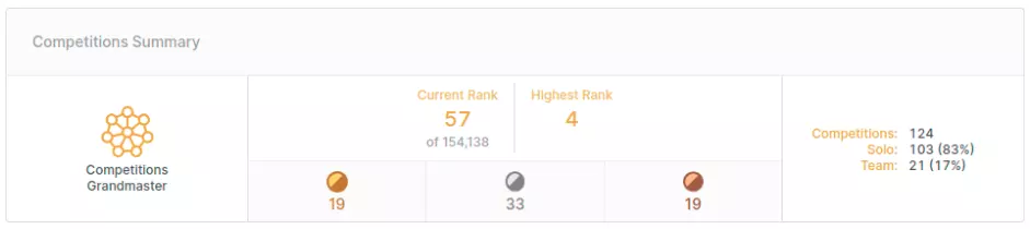 チームでの獲得賞金は $127,500 (約 1349万円)、個人の獲得賞金は $56,728 (約 600 万円)。Kaggle の Gold メダルは 19 個 (うちソロでの獲得が 8 個) であった。