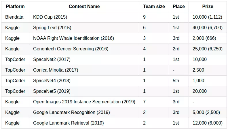 はじめは常にソロ参加で ”:-)” というふざけたハンドルネームで Kaggle のコンテストに参加していた。 Kaggle Master となりランキング上位になったあたりでチームマージのリクエストを沢山もらうようになった。当時の point system ではチームメンバー数が 2 人であれば獲得する kaggle point は 1/2 となるため、チームを組まない人は多かったように思う。 ただしコンテストが終わった後、今ほど Kaggle 上での Solution やコードの公開に皆が積極的ではなかったので、勝つために何が不足していたのかわからないことが多かった。