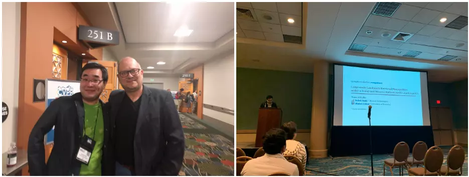 左は CVPR 2018 で Mirek Bober と記念撮影したときの写真。右は CVPR 2019 で発表しているところを撮影してもらった。