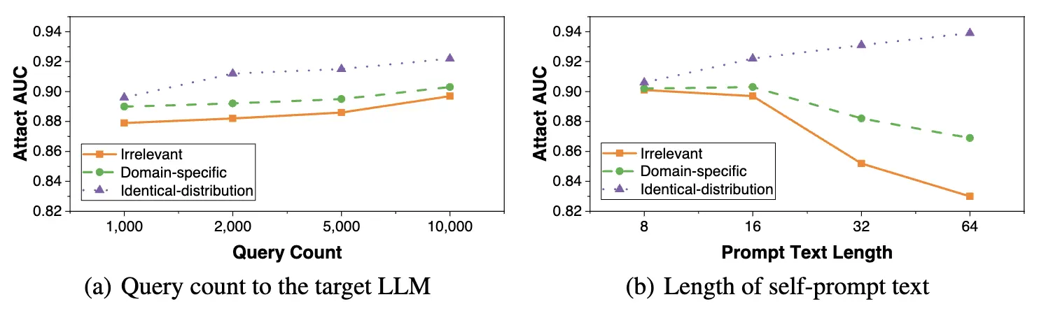 self-prompt を用いてリファレンスデータセットを作るためには、データの数だけターゲットLLMにクエリを投げる必要がある。下図(a)は、クエリを投げる量(リファレンスデータセットのサイズ)と Attack AUC の関係を示している。わずか1,000回のクエリでも、10,000回の場合と遜色ない攻撃性能を達成できることを示している。限られたAPIアクセス回数でも有効な手法であると言える。