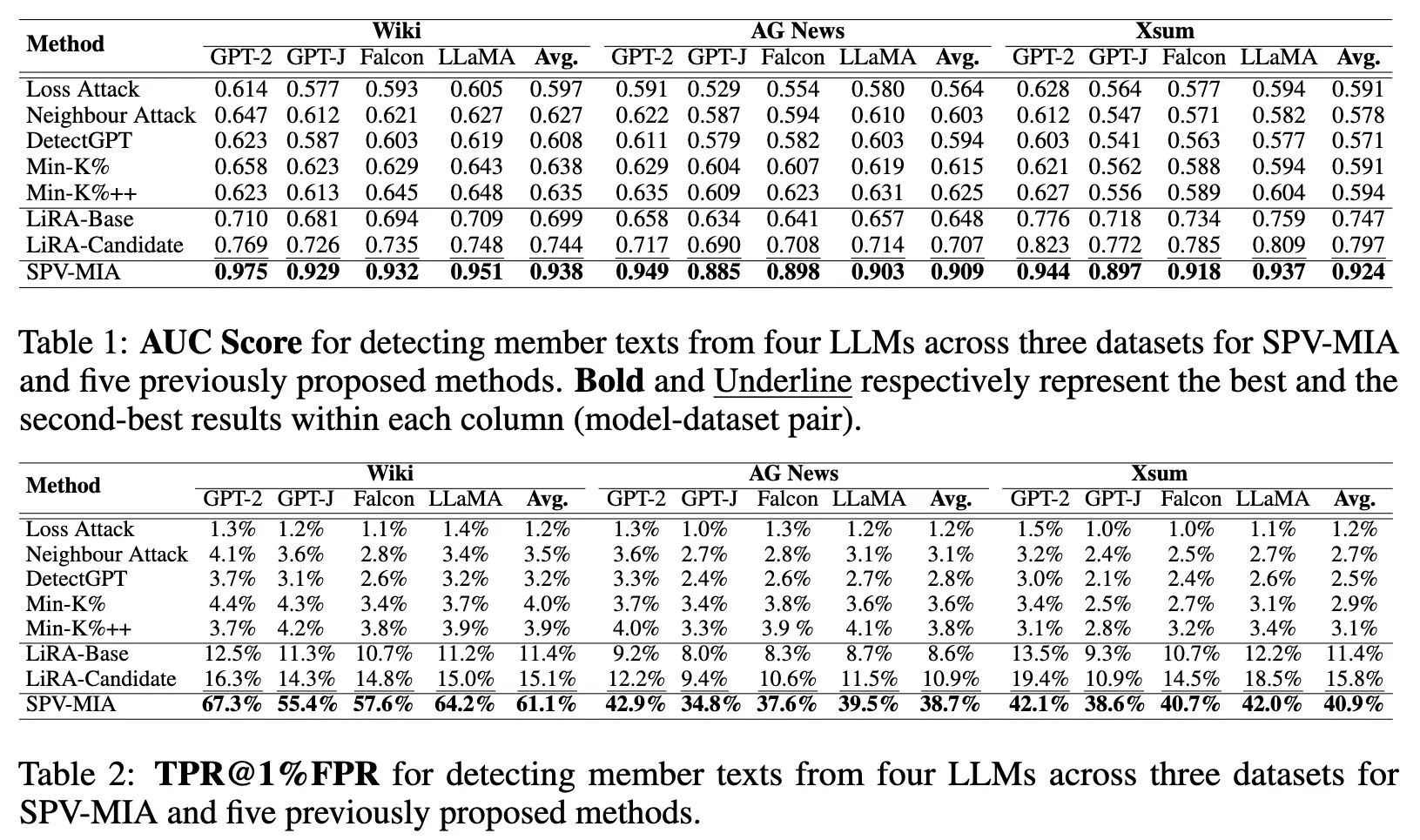 既存のMIAとオープンソースな LLM にて比較評価。オープンソースLLMの GPT-2, GPT-J, Falcon-7B, LLaMA-7B で実験している。リファレンスモデル不要の Loss Attack やリファレンスベースの LiRA に対してAUCスコア、TPR@1%FPRの両方で大幅に優れた性能を示している。