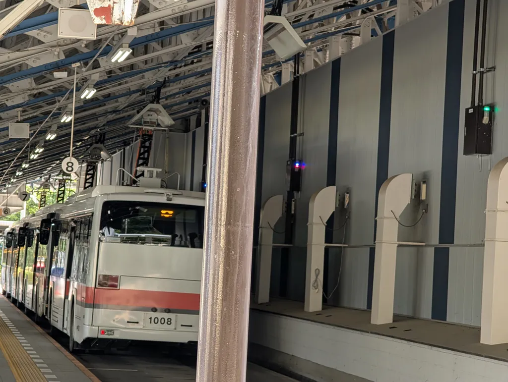扇沢〜黒部ダム区間は電気バスになっており、 都営バスで見慣れた日野自動車ブルーリボンを改造した車両が用いられている。 バッテリー容量はTeslaモデル3(2021)のスタンダードレンジと同程度の52.8kWh。 面白いのは充電形式。車載のパンタグラフ経由で充電してる。 独特すぎて最高に面白い。