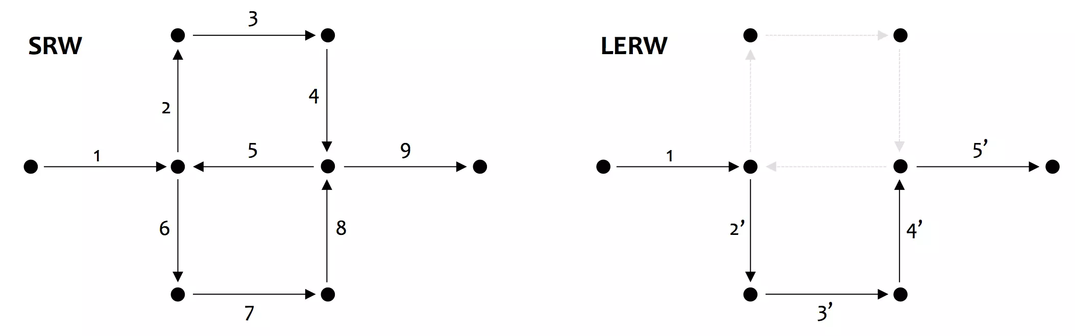 普通の単純ランダムウォーク (SRW) をグラフ上で実行した場合,そのパスはループ(閉路や多重辺)を生成する可能性がある. これに対して,ループ除去ランダムウォーク (LERW) は SRW からループが発生した時系列順にループを除去することで,ループのないパスを生成する.